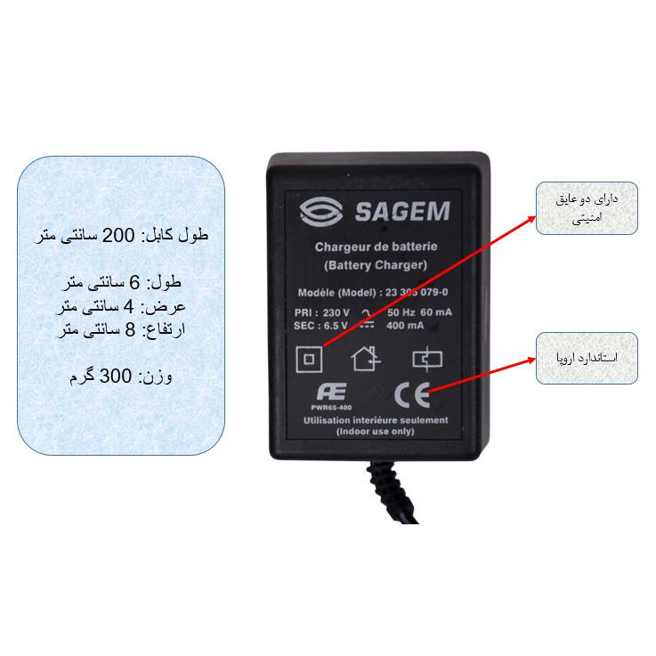 آداپتور ترانسی 6.5 ولت با خروجی واقعی 400 میلی آمپر از برند معتبر ساجم دارای استاندارد اروپا و دو عایق امنیتی طول کابل: 200 سانتی متر نوع فیش:فیش این آداپتور مخصوص دستگاه خاصی است در صورت نیاز می توانید فیش این آداپتور را تعویض کنید