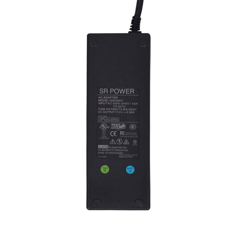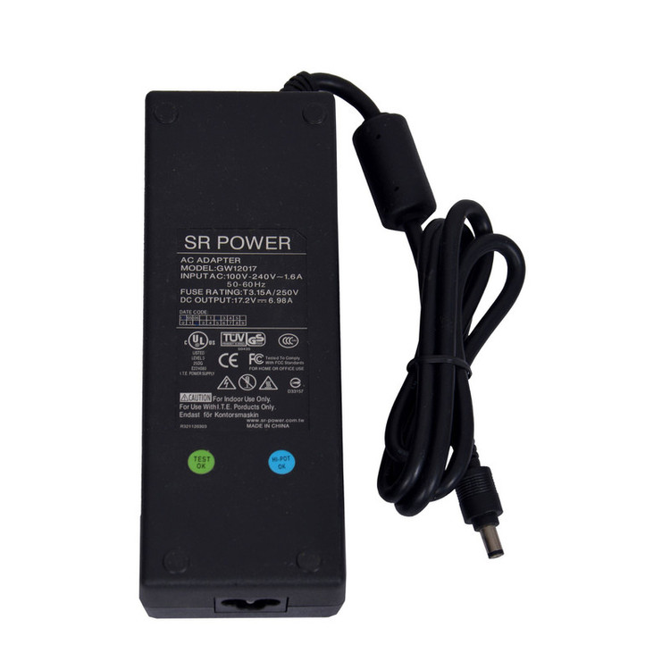 آداپتور 17.2 ولت از برند معتبر SR POWER با خروجی واقعی 6.98 آمپر دارای چندین استاندارد جهانی طول کابل:100 سانتی متر قطر فیش: 5.4 میلی متر
