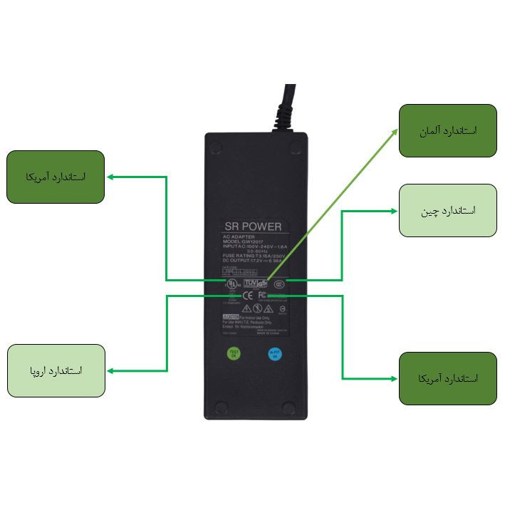 سایر توضیحات: آداپتور 17.2 ولت از برند معتبر SR POWER با خروجی واقعی 6.98 آمپر دارای چندین استاندارد جهانی