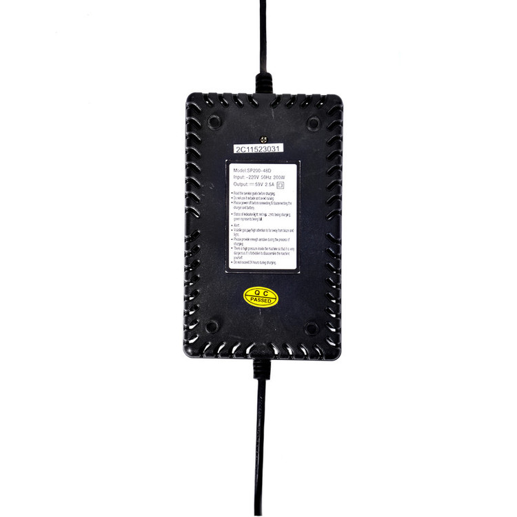 شارژر 59 ولت 2.5 امپر اتوماتیک جهت شارژ موتور شارژی ،دوچرخه شارژی و ماشین شارژی که 4 عدد باطری 12 ولتی سری شده داشته باشند . به عبارتی 4 عدد باطری 12 ولت سری ولتاژی حدود 48 ولت دارد که برای شارژ مجموع انها به همچین شارژی نیاز دارید .