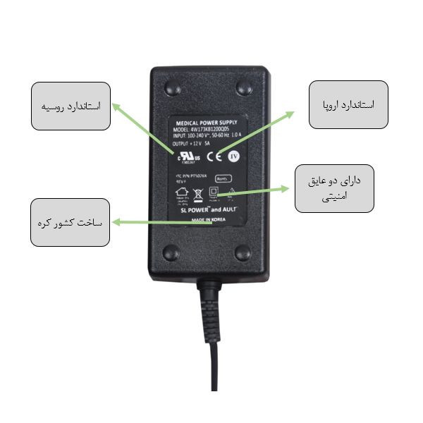 آداپتور12 ولت دارای استاندارد های روسیه و اروپا و همچنین دارای دو عایق امنیتی