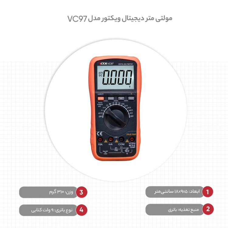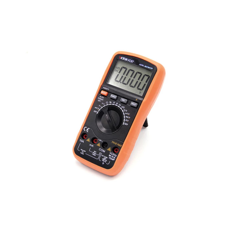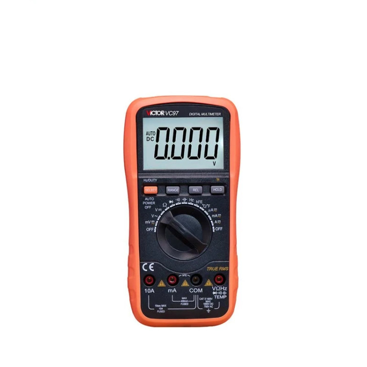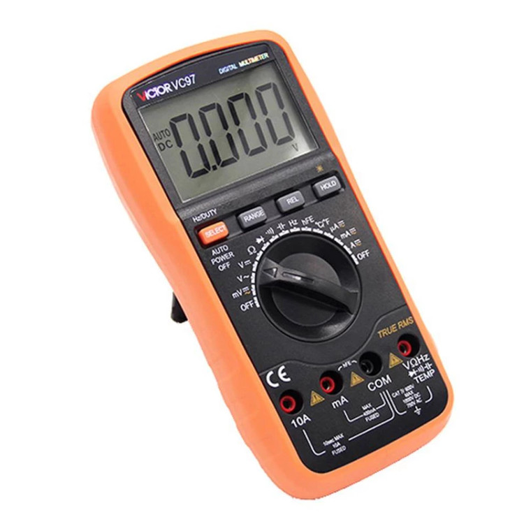 مولتی متر دیجیتال اتورنج سلکتوری AC،DC مدل VC97 کارخانه Victor جزء یکی از کاربردی ترین و اصلی ترین تجهیزات دقیق تست و اندازه گیری جهت تعمیرات، تولید و راه اندازی در آموزشگاه ها، آزمایشگاه ها، صنایع، کارخانجات، کارگاه های تولیدی و تعمیرگاه های برق و الکترونیک محسوب میشود و از طریق آن میتوان ولتاژ، جریان، مقاومت الکتریکی، ظرفیت خازنی، فرکانس و دما را اندازه گیری نمود.