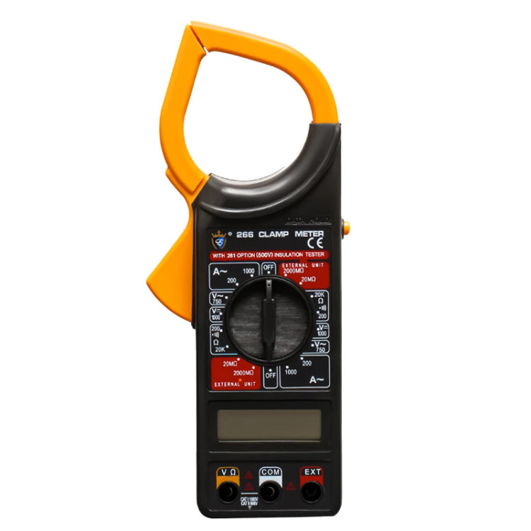 این ابزار آزمایش و سنجش که آن را کلمپ متر Digital Clamp Meter مینامند در واقع بسیار شیبه به انواع مولتی متر است با این تفاوت که از این ابزار برای اندازهگیری جریان و ولتاژهای بسیار بالا بی آن که نیازی به تماس با سیم حامل جریان باشد استفاده می شوند. در واقع برای جریان های بالا با استفاده از قلابی که بر روی کلمپ متر دیجیتال DT266 در نظر گرفته شده است می توان بدون دست زدن به سیم و کابل برق جریان را سنجید. کافی است این قلاب را باز کرده و به دور کابل مورد نظر قرار دهیم تا جریان اندازه گیری شود. کلمپ متر دیجیتال DT-266 انواع گوناگونی دارد اما این مدل از کلمپ متر از کامل ترین انواع است که نتایج داده های به دست آمده را از طریق نمایشگر LCD به صورت دیجیتالی نشان می دهد.