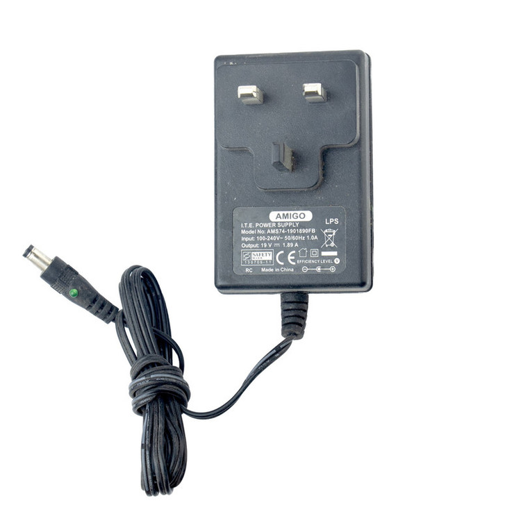 آداپتور 19 ولت از برند معتبر آمیگو با خروجی واقعی 1.89 آمپر دارای استاندارد اروپا و دارای دو عایق امنیتی.